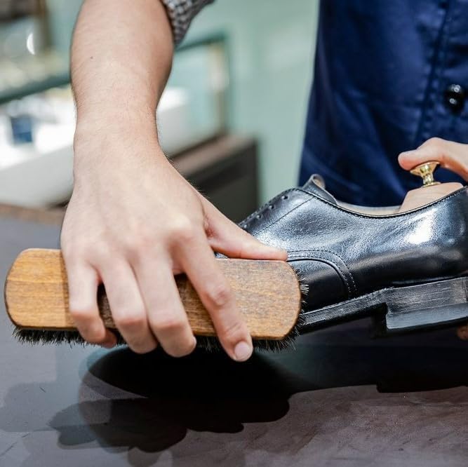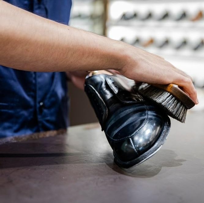 靴クリームを塗った後、クリームを伸ばしたり、なじませたりする→かたい毛(強い毛)が最適です! クリームを靴になじませ、伸ばすことにより光沢もでます。コシがある化繊毛は長く使えてしっかりと靴に光沢感を与えます。プロは毛がしっかりとしていて少し硬めの化繊毛を使用しています。その最大の特長は靴クリームを塗った後にクリームを全体に伸ばしたり、皮革に馴染ませたりするときの使い勝手の良さにあるのです。握りやすさと小さくなく、大きくもないジャストサイズも人気の秘密です。プロブラックブラシは黒クリーム用、プロホワイトブラシは茶系用など、ブラシで色分けができるようになりましたので色違いで是非どうぞ! ! ドイツ製・イタリア製も選べるようになりました。同サイズ・同様の化繊毛で、柄の部分の色が黄土色(ドイツ製)と赤茶色(イタリア製)の違いがありますが仕上げ用ブラシとしては両者とも同等のクオリティです。 ■用途:スムースレザー(一般的な表革)の靴、パンプス、ブーツ■毛の種類:化繊毛■サイズ:183mm 50mm 毛の長さ約25mm■原産国:ドイツ製またはイタリア製