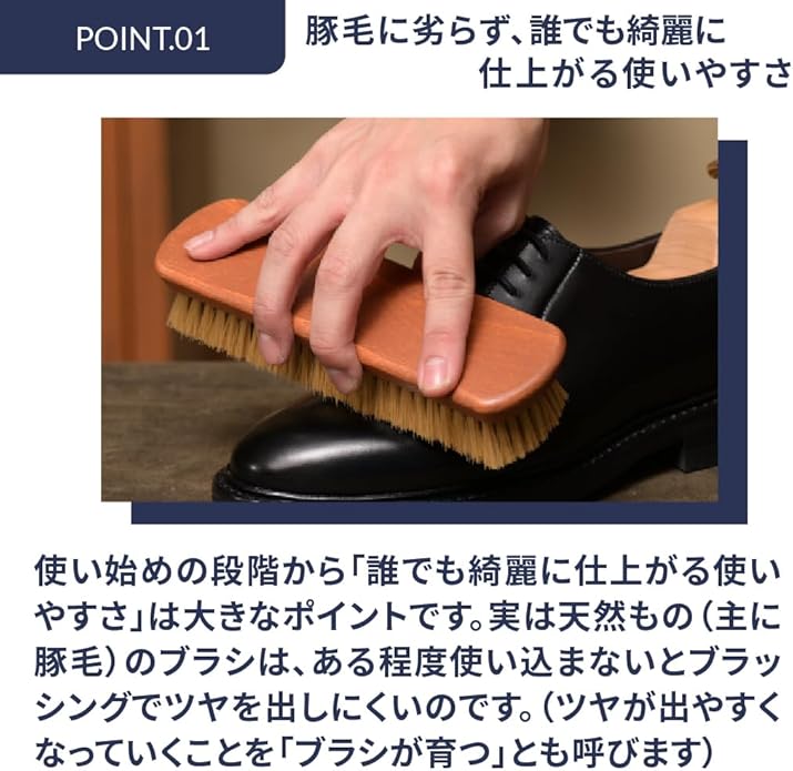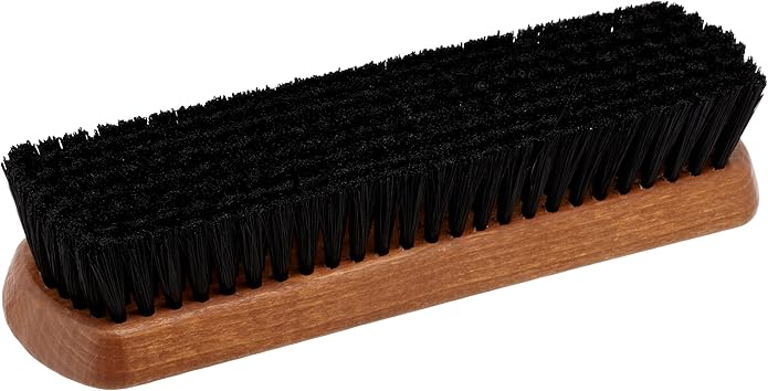 靴クリームを塗った後、クリームを伸ばしたり、なじませたりする→かたい毛(強い毛)が最適です! クリームを靴になじませ、伸ばすことにより光沢もでます。コシがある化繊毛は長く使えてしっかりと靴に光沢感を与えます。プロは毛がしっかりとしていて少し硬めの化繊毛を使用しています。その最大の特長は靴クリームを塗った後にクリームを全体に伸ばしたり、皮革に馴染ませたりするときの使い勝手の良さにあるのです。握りやすさと小さくなく、大きくもないジャストサイズも人気の秘密です。プロブラックブラシは黒クリーム用、プロホワイトブラシは茶系用など、ブラシで色分けができるようになりましたので色違いで是非どうぞ! ! ドイツ製・イタリア製も選べるようになりました。同サイズ・同様の化繊毛で、柄の部分の色が黄土色(ドイツ製)と赤茶色(イタリア製)の違いがありますが仕上げ用ブラシとしては両者とも同等のクオリティです。 ■用途:スムースレザー(一般的な表革)の靴、パンプス、ブーツ■毛の種類:化繊毛■サイズ:183mm 50mm 毛の長さ約25mm■原産国:ドイツ製またはイタリア製