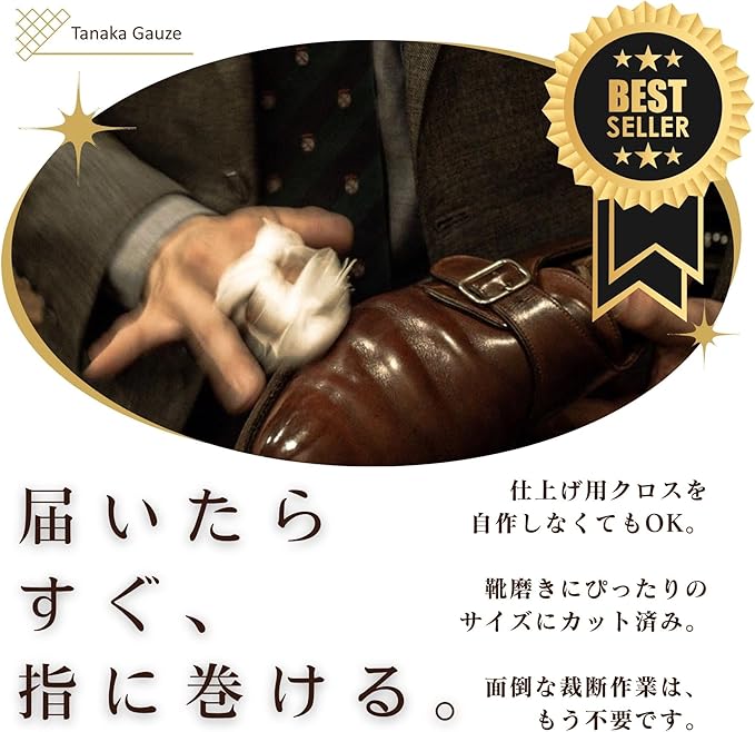 靴磨きは好きだけど、仕上げ用のクロスはどれもこれも大きすぎて使いにくい!でしょ。 ピンキングはさみでも、裁ちはさみでも、どのはさみを使ってもうまく切れない!! でも「シューピッカー」は細長くカットされていて、届いたらすぐ指に巻いて使えます。 磨くのがもっと楽しくなります。 はさみで切らなくていいので手が楽。やったぜ「ミガケル シューピッカー」