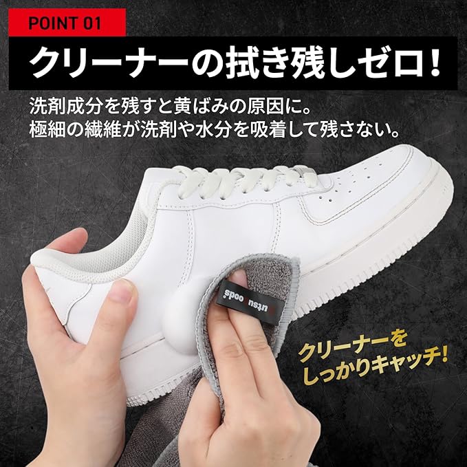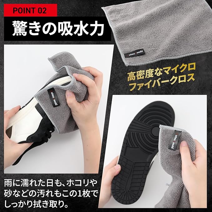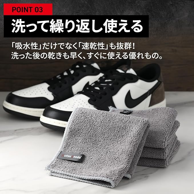 【吸水性・速乾性に優れた設計】 ・スピード吸水で濡れた靴もサッと拭き取り ・速乾性が高く、洗った後もすぐに使える ・靴磨きやスニーカーケアに便利