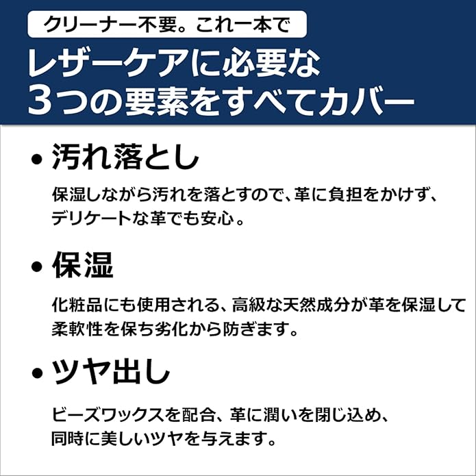 【あらゆる革製品のお手入れはこれ1本でOK!】レザーバッグ、財布、ベルト、革靴、革ジャン、ソファ、レザースニーカーなど汚れ落とし、保湿、ツヤだしまでお手入れの全てがこれ一本でできる、オールインワンのレザーローションです。