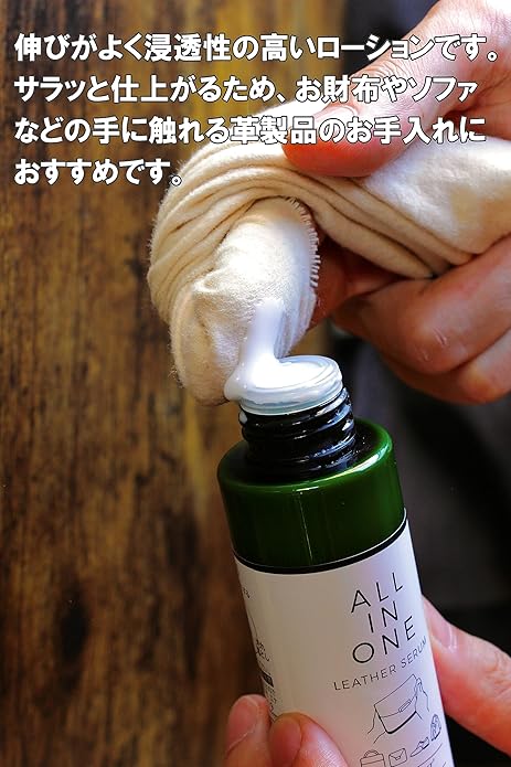 ツヤ出し、汚れ落とし、保革を1本で可能にするオールインワンローションです。