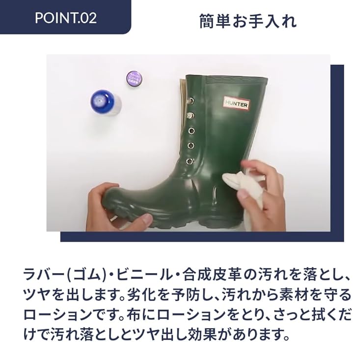 【ラバーのお手入れはもう常識です! 】ラバー製品はそのままでは劣化してしまうもの。一昔前のいわゆる“長靴"であれば、履きつぶし感覚でもOKでしたが、これだけ多様化し、限定商品化した現在のレインブーツは、お手入れが常識です。ラバー製品は定期的にお手入れすることで劣化を“予防"することが最大のポイントになります。ラバー(ゴム)・ビニール・合成皮革製品専用のケアローションです。布にローションをとり、さっと拭くだけで汚れ落としとツヤ出し効果があります。■原産国:日本製■容量:100ml■用途:ラバー(ゴム)・ビニール・合成皮革の靴、ブーツ、パンプス、長靴、バッグ、サイフ、ベルト等 【使用法】●フタを閉めたまま容器をよく振り、ポリッシングコットン等の柔らかい布に適量取ってください。●布にローションが染み込みましたら、軽く汚れをふき取るように塗ってください。●最後にから拭きしますと、美しい光沢が出てきます。※注意※●上記以外の用途には使用できません。●目立たない部分でテストしてからご使用ください。●子供の手の届かない所に保管してください。●劣化等による黄ばみは落ちません。●一度劣化してしまった素材を回復させることは出来ません。