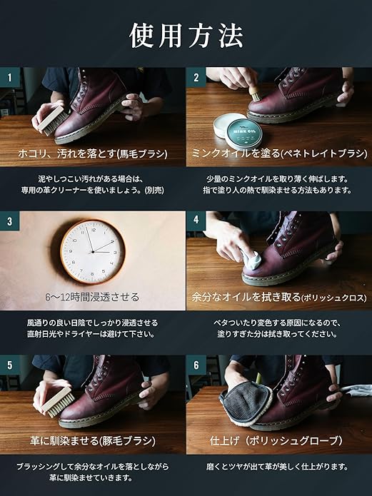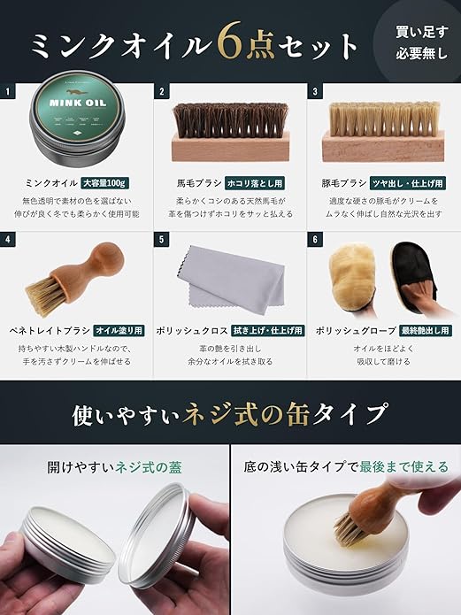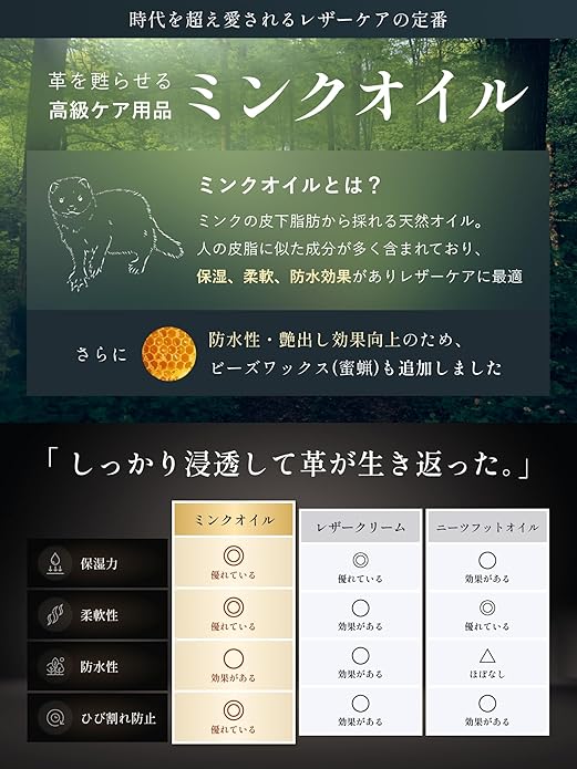 ✅【無着色・無香料の安心成分】天然ミンクオイルを高純度精製し、蜜蝋やワセリンをバランスよく配合。革本来の通気性と風合いを守りながら、色ムラや白残りを防止します。子供用シューズやペット用品にも応用可能で、ギフトにも喜ばれる上質ケアアイテムです。