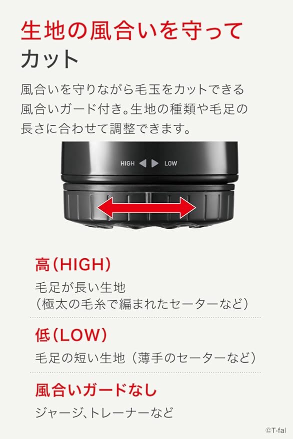 風合いガード:生地の風合いを守りながら毛玉をカット。ニットやジャージなど、生地の種類や毛足の長さに合わせて、高(HIGH)~低(LOW)まで調整可能。
