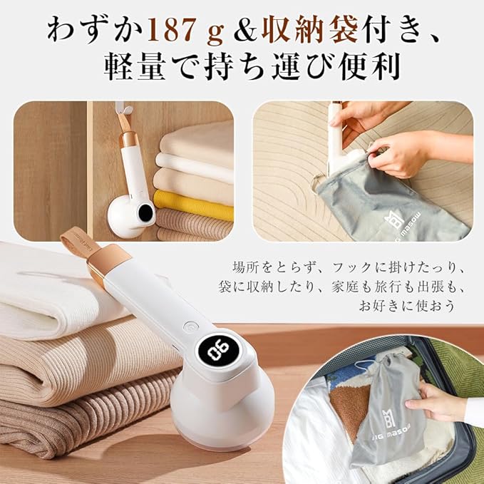 【細かいところも配慮!安全ロック&ストラップ設計&収納袋付き】カバーが緩んでいるときに自動電源オフ、使用中不意に触れた場合と、小さな子供が誤って触れた場合にも。わずか8.8*8.5*21cmの小型サイズで、端にはストラップ、かわいい収納袋が付いています。場所を取らず、収納に便利です。キュートな見た目も部屋の雰囲気にマッチしています。家庭用だけでなく、スーツケースやバッグに入れて、毛玉に悩まされずに旅行や出張をしましょう!