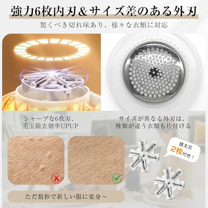 【強力6枚内刃&直径35mm外刃、替え刃二枚付き】6枚内刃と直径35mm外刃を合わせて、従来の3枚刃製品より超強力で、衣類を傷つけずに大量の毛玉を簡単に素早く取り除きます。小口径の外刃が服へのダメージを抑え、ただ衣類の上に移動させると、服を清潔にしながら、気持ちも幸せになります!替え刃が2枚付属しているので、ただ一つの刃がくすんだり摩耗したりする心配はないです!お客様へのご注意:輸送と保管時間の都合上、到着時に製品のパワーが100%に満たない場合があります、予めご了承くださいませ。