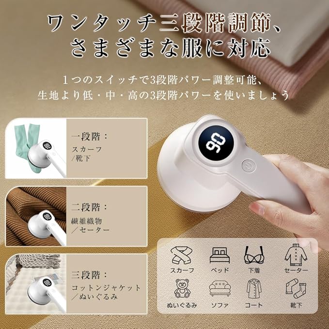 【ワンタッチ三段調節、様々な生地に対応】複雑な操作要らなく、ワンタッチで簡単に低・中・高の3段階調整できます!生地によって必要なパワーを自由にお選びください。シャツ、セーター、コートやジャンパーだけでなく、ソファ、寝具、カーテン、ぬいぐるみでさえも楽々。ご注意:衣類は平らにし、折り目のある部分には使用しないでください。また、傷つけやすい生地や貴重な生地には使用しないでください。