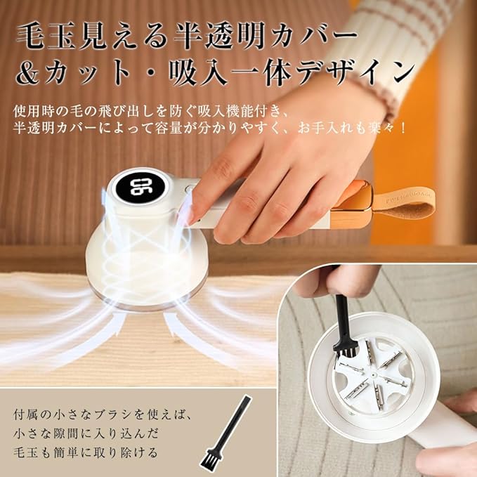 【一目見えるLEDスクリーン&半透明カバー】段階と残電力をリアルタイムで表示するLEDスクリーンがあり、使用中に残電力がわからなくなって突然停止する手間を軽減します。製品内部の毛玉の量が見えず、使用中にカバーから毛玉が飛び出してしまったら?同じように一目でわかる半透明のカバーは、容器内毛玉の量をはっきりと確認でき、付属のブラシでのお手入れも簡単です。