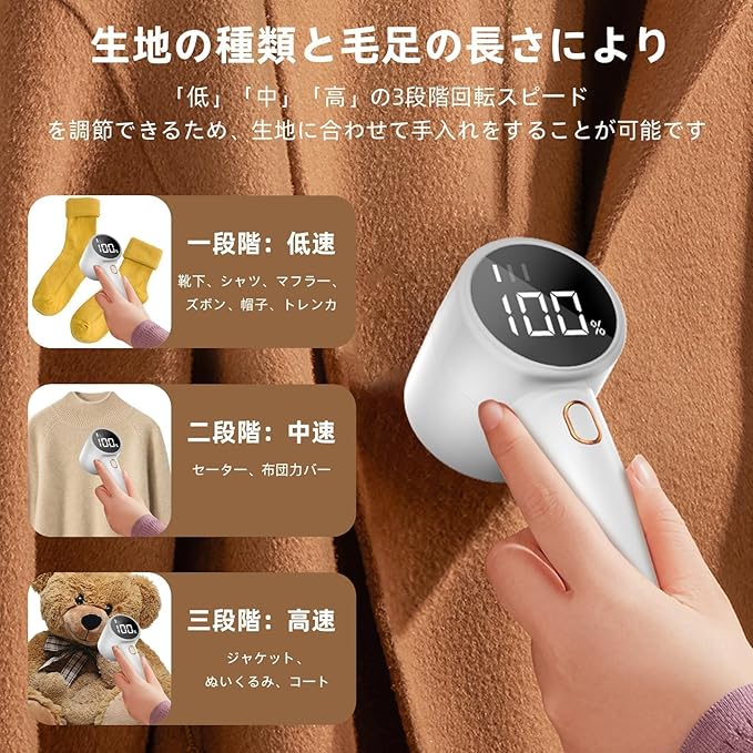 【3段モード調節&様々な生地に対応】 生地の種類と毛足の長さによって、回転スピードを低-中-高で調整できます。衣類のほかにもぬいぐるみや寝具、ソファなど幅広く使えます。