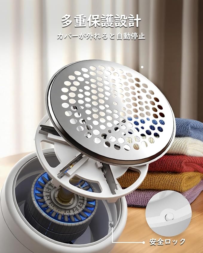 【確かな多重保護設計】当社の毛玉取り機は、衣類を保護し摩擦を軽減するハニカムネットカバーを採用。さらに、けだま取り器のブレードカバーが正しく閉まっていない場合に自動で停止する安全ロック機構を備えており、意図しない動作を防止。繊細な衣類にも配慮した、信頼してお使いいただける毛玉取り 電動製品です。