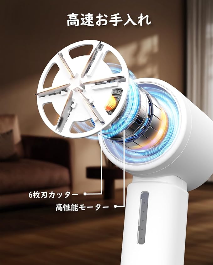 【6枚刃設計 & 吸引機能の毛玉取り器】この毛玉取り 電動モデルは、鋭く耐久性のある6枚刃と強力なモーターを搭載したけだま取り器で、様々な衣類や毛布に付いた毛玉やふわふわを素早く除去し、素材の本来の風合いと美観を蘇らせます。同時に、切り取った毛玉を本体が自動的に吸引するため、毛玉が衣類に再付着する心配がなく、使いやすく手間いらずの快適なけだまとりを実現します。