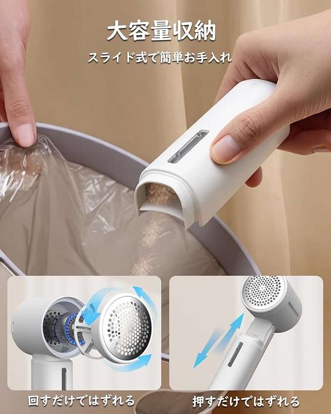 【大容量ホルダーでまとめて毛玉取り】この充電式毛玉取り 電動モデルは大容量のホルダーを内蔵しており、複数の衣類をまとめてけだま取りしても、頻繁な取り出しや交換が不要です。使用中はホルダーが確実にロックされ、毛玉の飛散を効果的に防止。お手入れ時はスライドするだけで簡単に取り外せて、清掃が迅速かつ便利なけだま取り器です。