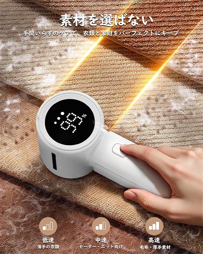 【3段階調整&LED画面の毛玉取り器】この毛玉取り 電動モデルは、3段階の速度調節と明瞭なLEDデジタル画面を搭載。電源ボタンで簡単に切り替え可能で、シルクから厚手のコートまで、素材に応じた最適なけだま取りを実現します。バッテリー残量・使用速度・充電状態がひと目で確認できる智能設計です。