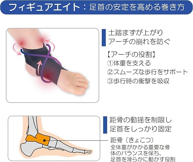 ●足首の安定を高める巻き方で、土踏まずが上がりアーチの崩れを防ぐ