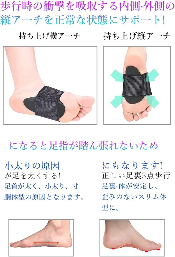 【足裏の悩みに】足裏の筋肉を持ち上げ、足の土踏まず部分に直接圧を加え、足裏を支えることで、足裏のトラブルにも役立ちます。