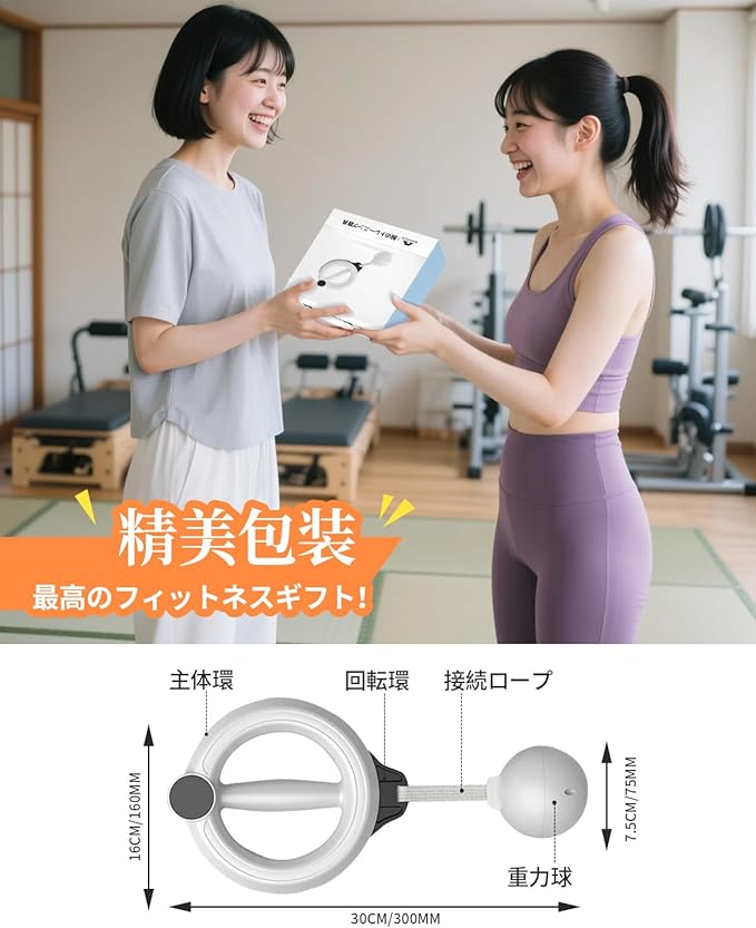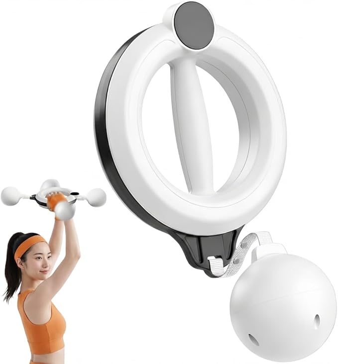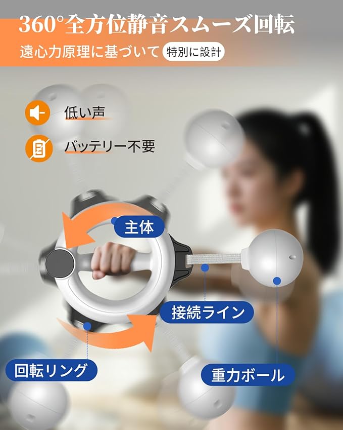 【Minezakiの新デザインが登場】腕のトレーニング用のフラフープ。材質:本体リング+重力ボール(PP素材)、ロープ(頑丈なナイロン素材);サイズ:約16cm*19cm(本体部分)、約7.5cm(ボールの直径);重量:約0.5kg。電源不要、組み立て不要、受け取ったらすぐに使用可能。内蔵の環状回転トラックと吊り下げ式の重力ボールにより、360 全方位で静音かつスムーズに回転します。回転中に発生する遠心力と慣性により、あまり力を入れずに筋肉を鍛えることができます。