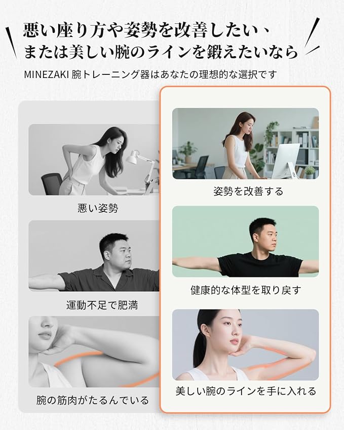 【さまざまな人々に適用可能】長時間働くことや運動不足の方に、まずこの製品をお勧めします!前腕トレーニング器具は、座り方の改善に非常に効果的です。肩と腕を鍛え、弛んだ二頭筋を排除し、脇肉を取り除き、細い腕を形成し、胸を引き上げて猫背を矯正し、細長い上腕と前腕を作り出します。このような期待がある方には、Minezakiの腕トレーニング器具が最適な選択となるでしょう。