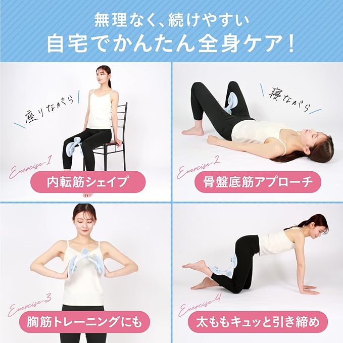 ✅【 内転筋・骨盤底筋を“ながら”トレーニング 】 本商品は、内転筋や骨盤底筋をおうちで手軽に鍛えられる器具です。「座りながら」「寝転びながら」「立ちながら」など、“ながら”トレーニングにぴったりのアイテムです。忙しい日々のスキマ時間に、ぜひご活用ください。