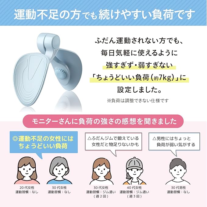 ✅【 運動不足の女性にオススメの負荷量 】 運動不足の方でも使い続けられるよう、負荷は強すぎず弱すぎない「適度な強さ」に調整しました。モニターさんの感想でも「運動不足の女性にちょうどいい」という意見がもっとも多かったです。逆に、ふだんから高負荷な筋トレをされている女性や、成人男性にとっては負荷が軽く感じられる可能性があります。「運動不足を解消したい!」という女性にオススメな商品となります。
