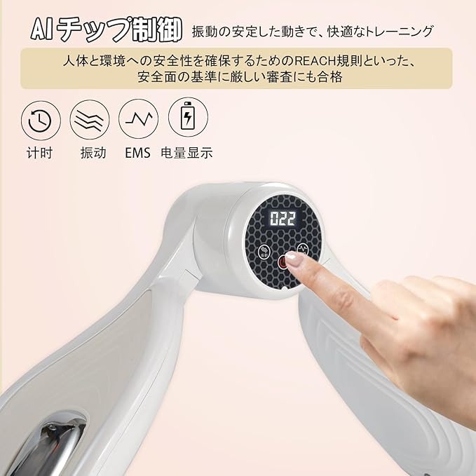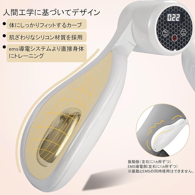 【理想的なデザイン】独自のV形状にバネ伸縮機能・振動機能・EMS機能をこれ一台で実現。広がろうとするバネの力に対して脚で挟んで保つことで筋肉を鍛え、挟んだ力と一緒に電気の刺激が入るので、短時間でしっかり内もものトレーニングができます。さらに、最大約6,500回/分の振動で筋肉にゆるめ、硬くなった筋肉を柔らかくして、柔軟性を高めます。集中ケアで効率的な「骨盤力UP」を実感。