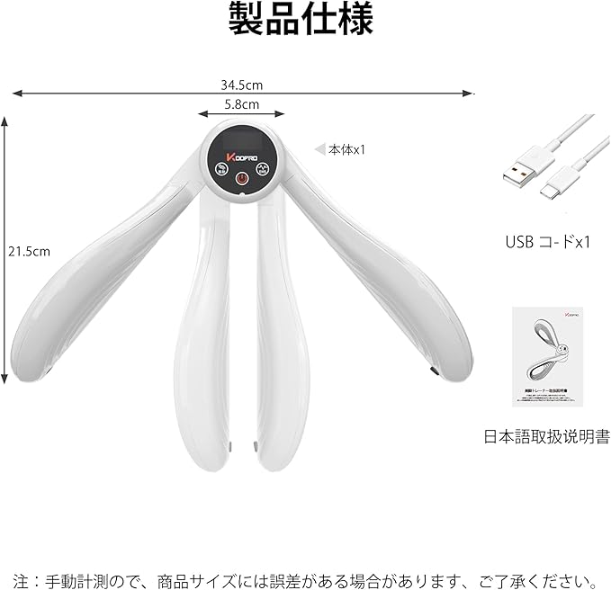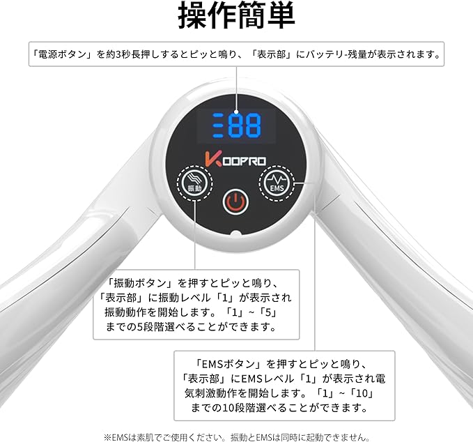 【操作簡単&男女兼用】「電源ボタン」を約3秒長押しするとピッと鳴り、「表示部」にバッテリ-残量が表示されます。「振動ボタン」を押すとピッと鳴り、「表示部」に振動レベル「1」が表示され振動動作を開始します。「1」~「5」までの5段階選べることができます。「EMSボタン」を押すとピッと鳴り、「表示部」にEMSレベル「1」が表示され電気刺激動作を開始します。「1」~「10」までの10段階選べることができます。充電式なので、どこでもお使いいただけます。