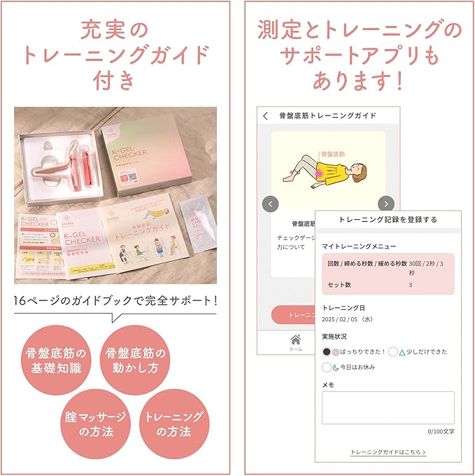 骨盤底筋トレーニングガイド付きなので、初心者の方も安心です。