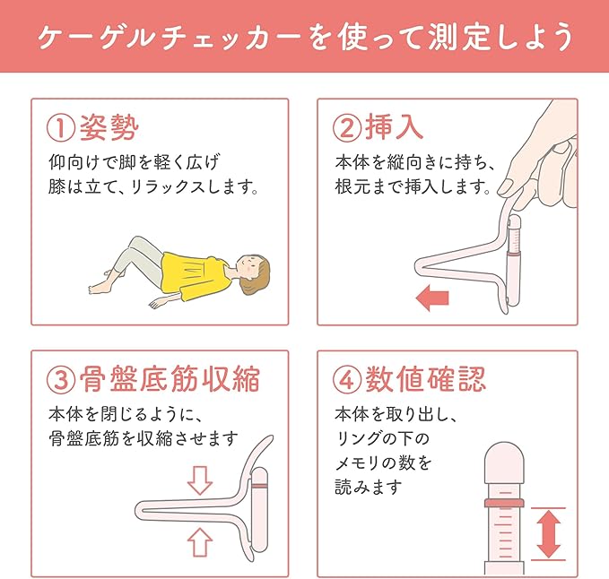 ①仰向けで足を軽く広げ、膝はたて、リラックスします。②本体を縦向きに持ち、根元まで挿入します。③本体を閉じるように、骨盤底筋を収縮させます。④本体を取り出し、リングの下の目盛りの数を読みます。