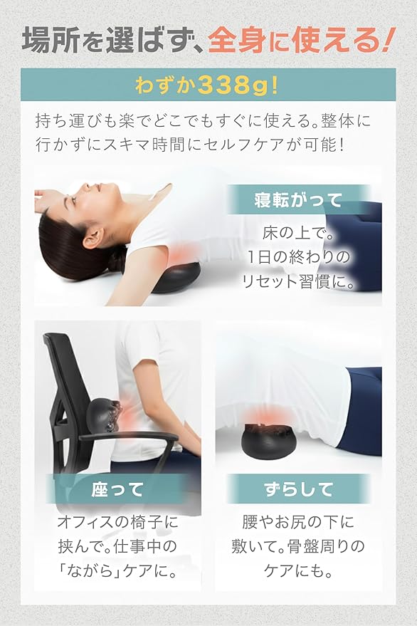 【いろいろな使い方で全身ケア】 椅子やソファーに置けば肩・背中・腰の気になる部分を心地よくほぐせます。