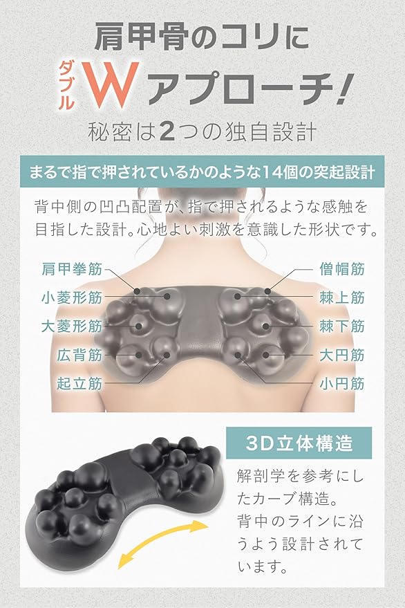 【肩甲骨のコリにダブルアプローチ】 伸ばすストレッチと突起によるポイント押しで、肩まわりの緊張をしっかりほぐします。