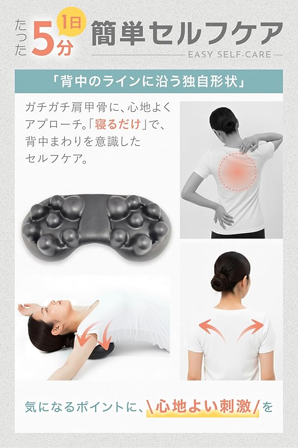 【1日5分の簡単セルフケア】 寝るだけで肩と胸を開き、背中の硬さを手軽にリリース。初めてでも安心して使えます。