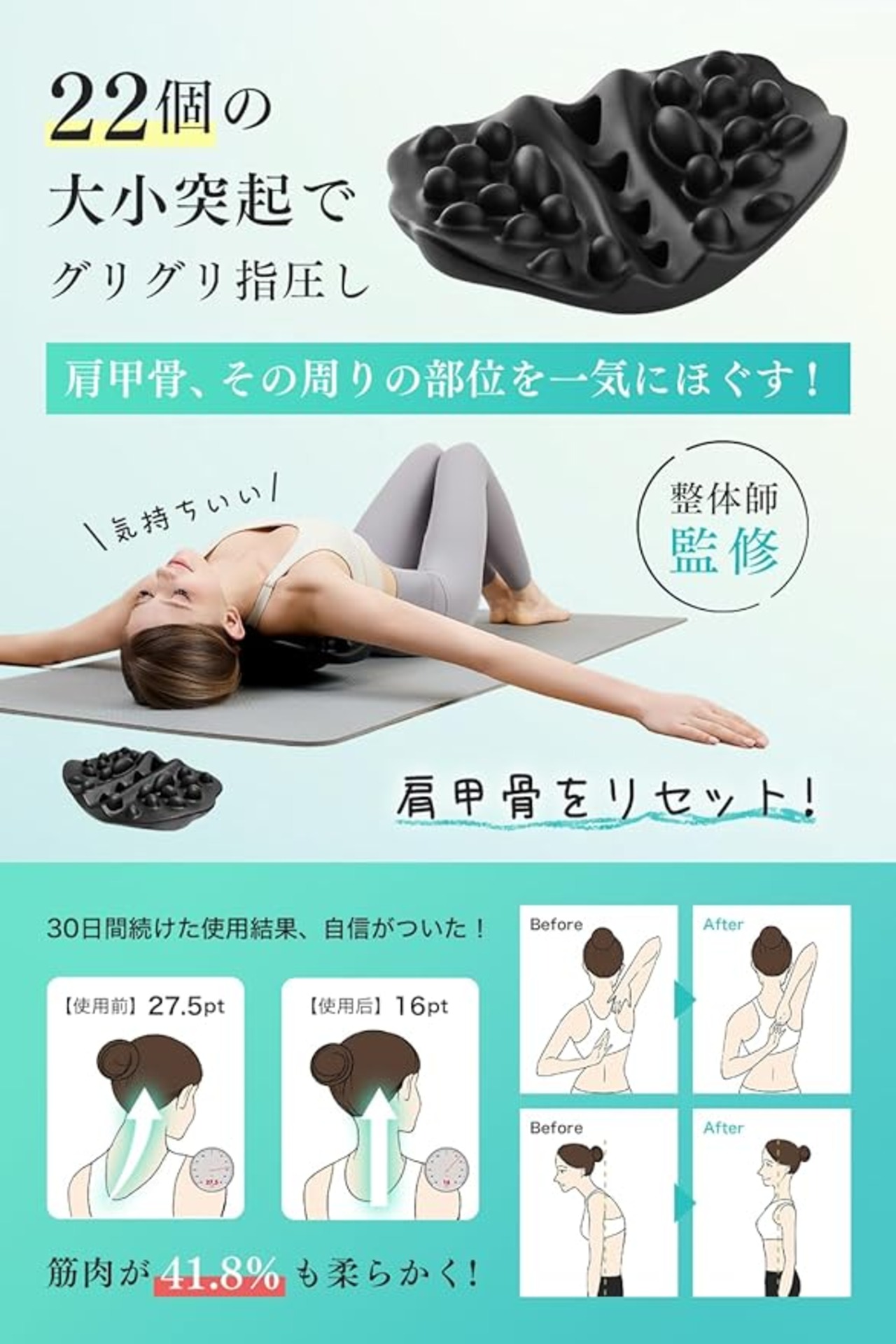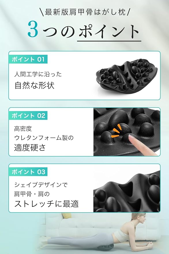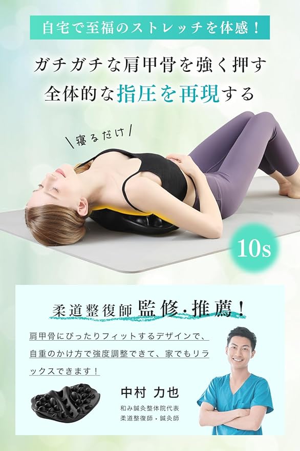 【独自の立体形状設計技術・22個の突起がツボを指圧】計 22 個の大小・形状の異なるグイ押し突起が、肩周りのコリを優しくほぐしてくれます。独自の立体形状が、どんより沈んだ肩甲骨をクイッと持ち上げ、程よいストレッチ感を与えます。寝ながらでも座りながらでも使えるので、忙しい毎日の合間に手軽に肩甲骨ケアができます。