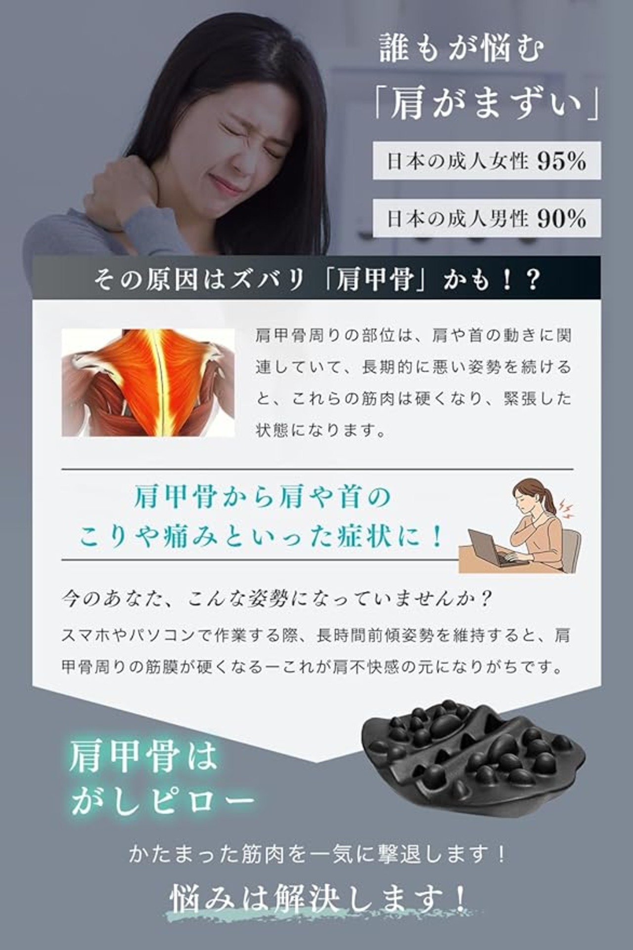 【1日5分の楽々ケア・整体師の優しい手技を再現】。長時間のパソコン作業やスマートフォンの使いすぎ、デスクワークなどで同じ姿勢を長時間続けると、肩甲骨周辺の筋肉が硬くなり、肩甲骨の動きが悪くなることがあります。肩の症状に関しては、肩甲骨が大きく影響しています。毎日5~10分ぐらい時間に肩甲骨まわりの筋肉のコリを押しほぐす、まるで誰かに押しほぐしてもらっているような気持ちよさをできます。