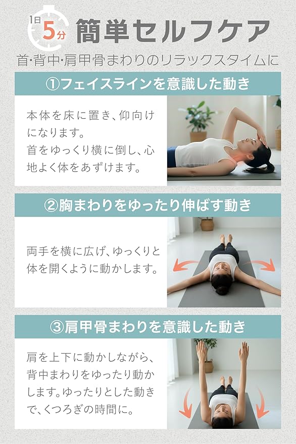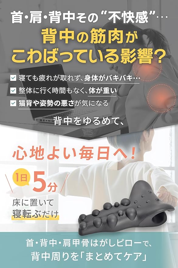 【1日5分の簡単セルフケア】 床に置いて寝転ぶだけで、肩甲骨や背中の緊張を和らげられます。日常のちょっとした隙間時間に手軽に使用可能です。