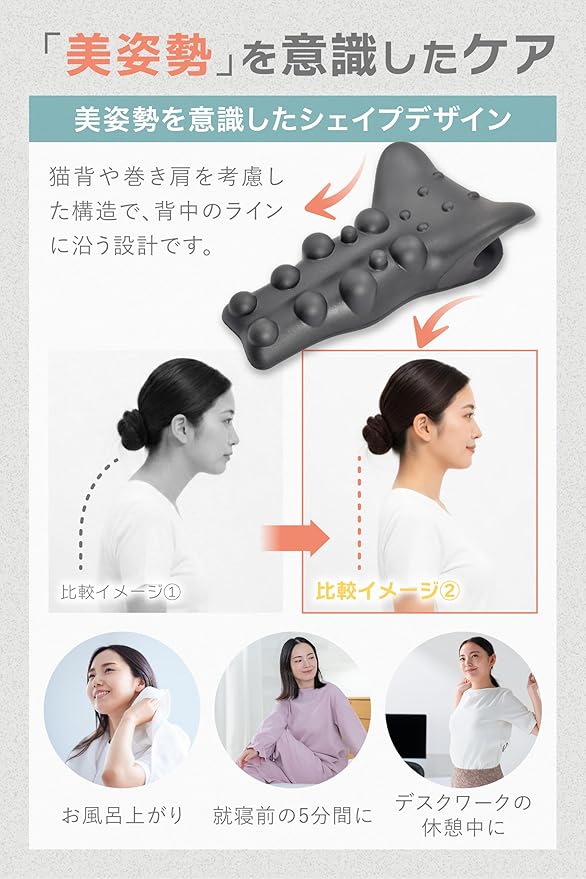 【理学療法士監修】 現役理学療法士が監修。日本人の平均的な体型に合わせて首や肩にフィットし、無理なくセルフケアが可能です。