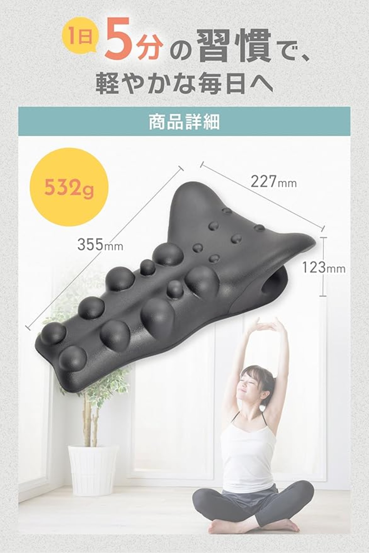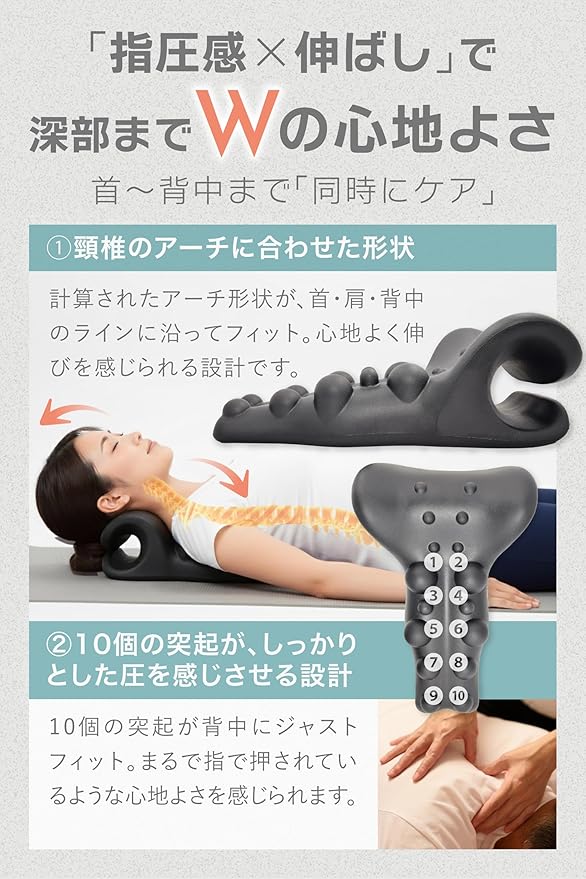 【首・肩甲骨・背中を同時にストレッチ】 仰向けで寝るだけで、首から肩甲骨、背中まで伸ばし、突起でツボを刺激して体感リフレッシュ。