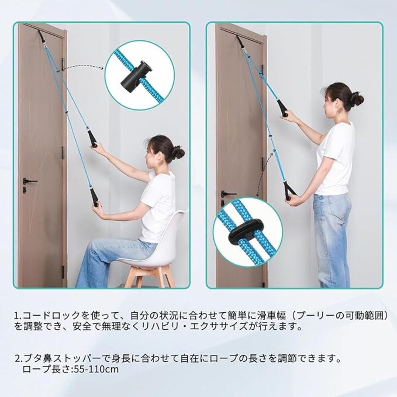【簡単な取り付け】ドアアンカーをドアの隙間に配置し、ドアをしっかり閉めます。ナイロンロープの長さを適切に調整したら、トレーニングを開始できます