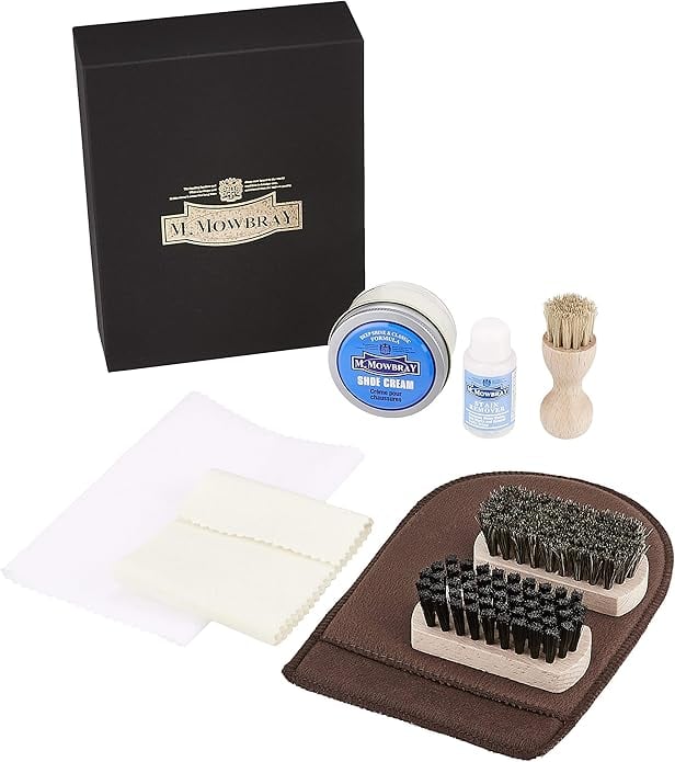 M.モゥブレィの人気商品、シュークリームジャー・ペネトレィトブラシを惜しげもなく使用しつつ、必要なものをコンパクトに収めた初心者向けのセット商品です。ちょっとした贈り物におすすめです。 セット内容:シュークリームジャー 1 ペネトレィトブラシ(クリーム塗布用) 1 ステインリムーバーミニ(汚れ落とし) 1 ホコリ落とし用馬毛ブラシ 1 磨き用化繊ブラシ 1 リムーバー用クロス(白) 1 乾拭き用クロス(ベージュ) 1 仕上げ/磨き込み用グローブクロス 1 使用手順:馬毛のブラシで全体をブラッシングし、ホコリを落とした後でステインリムーバーをクロスに取り靴を撫でるように拭きます。古いクリームやしみ込んだ汗を取ることが出来、靴がさっぱりとマットになります。ペネトレィトブラシにクリームジャーを少量(米粒2~3粒程度)取り、素早く全体に塗り広げます。化繊のブラシでクリームを全体に馴染ませ磨き込み、グローブクロスで乾拭きをして仕上げることで自然なツヤが出た仕上がりになります。