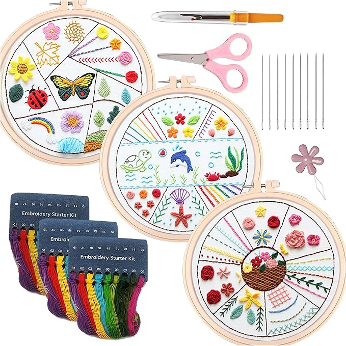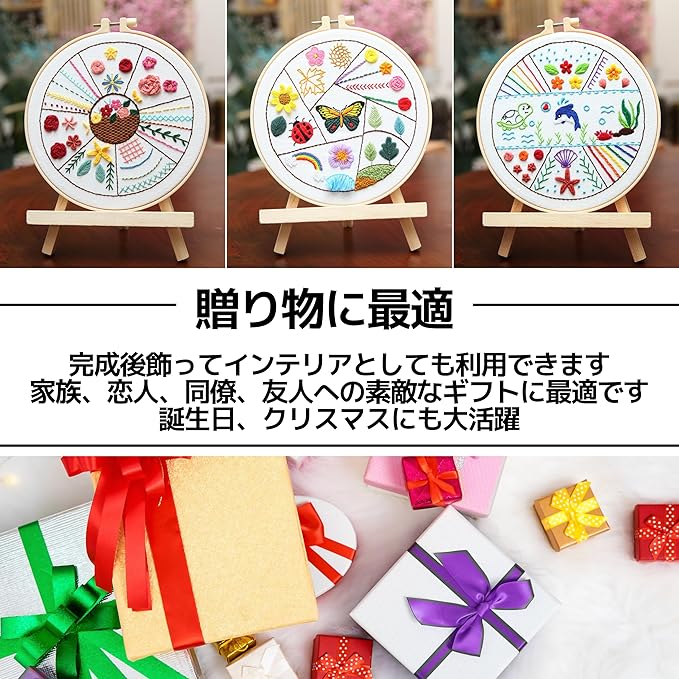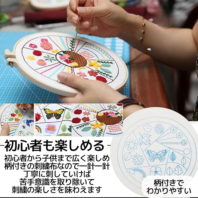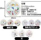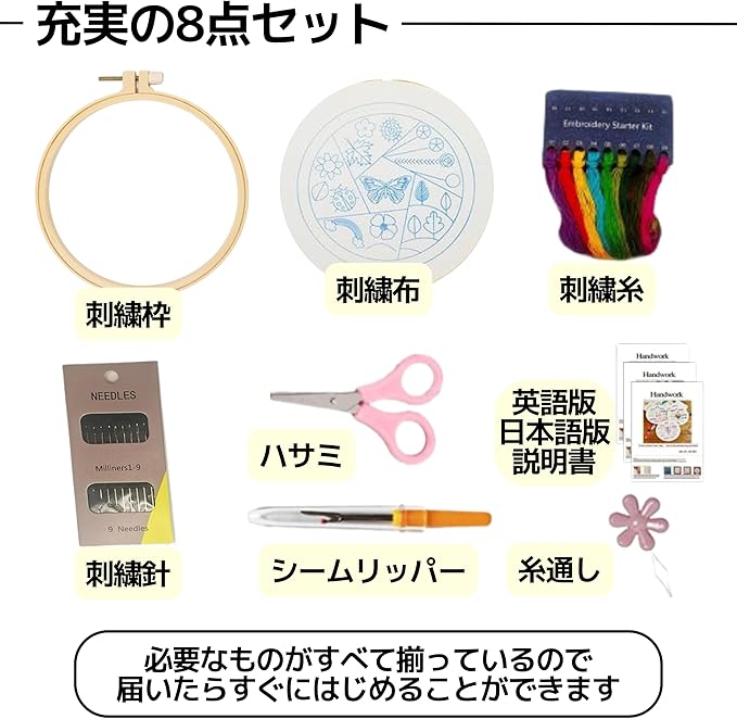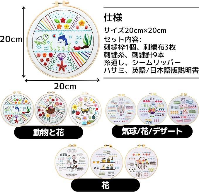 【仕様】サイズ:20cm 20cm、セット内容:①20cm刺繡枠1個、②刺繍布3枚、③刺繍糸3パック、④刺繍針9本、⑤ハサミ、⑥糸通し、⑦シームリッパー、⑧英語/日本語版説明書