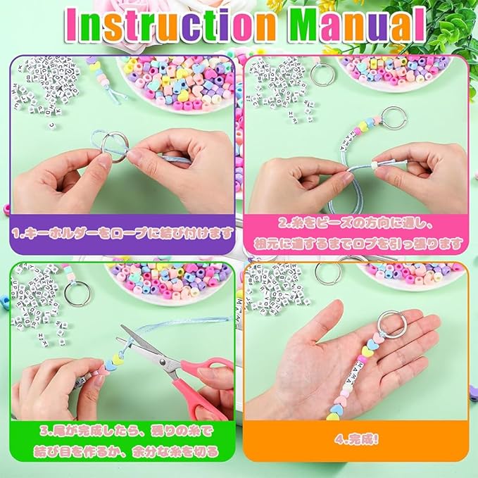 付属コンポーネント 金属製キーリング6個、紐4本、アルファベットビーズ150個、カラフルビーズ100個、ハート型ビーズ25個