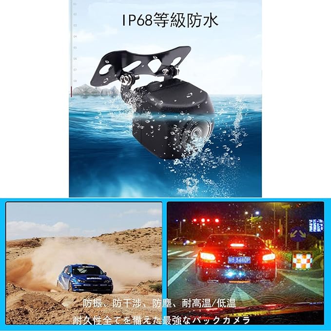 ★【画面明瞭】車載用バックカメラに専用的に設計した最新のハイビジョンHVDチップを採用し、画面がくっきり見えます。業界で誇りの高品質CCDセンサーを採用、200万高画素を確保します。 【高品質】アルミニウム合金と工業用プラスチック素材から構成されたリアカメラは、国際のIP67防水等級を取得します。さらに、防震、 防干渉、防塵、防高温/低温機能向上ため、工場から出荷する前に高圧防水と12時間の通電老化などのテストを実施しました。