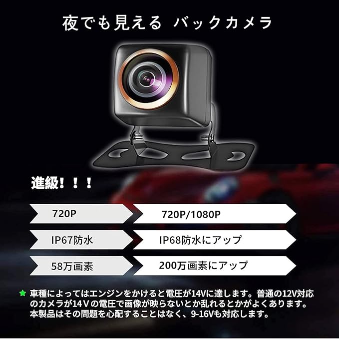 ★【1080P高画質200万画素、CCDセンサー搭載】 一般的なHOTの製品が100万画素であるのに対し、当社のリアカメラは有効画素数約200万画素の高感度CCDセンサーであり、高画質であることが特徴です。 自動露出補正センサーにより、太陽や夜間の明るい照明などの強い光源が記録素子に入った場合でも、カメラの縦方向は白筋が発生しません。 これにより、真夏の日中や街灯の下でも、白飛びすることなくクリアな画像を撮影することができます。