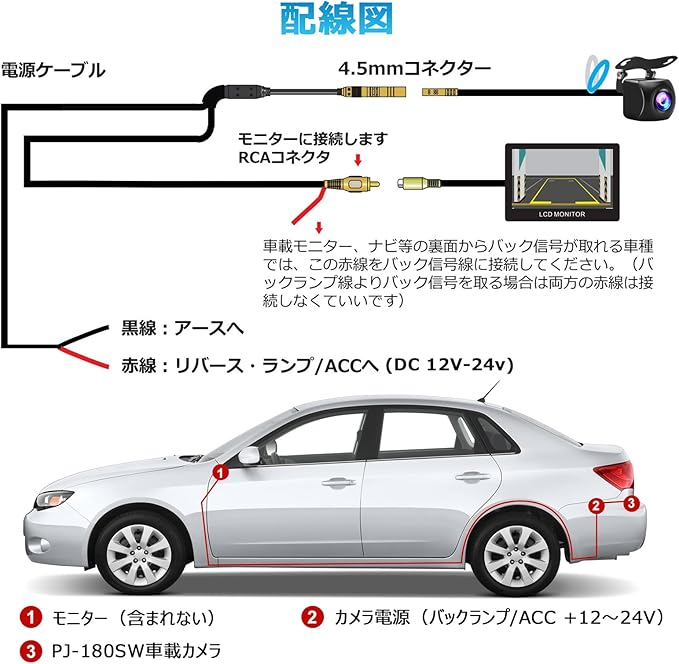 車汎用タイピ・高い交換性:mini4ピンコネクタ、RCA映像出力端子はほとんどのナビ、モニターに対応可能です。車の純正バックカメラとの交換性があって、ドライブレコーダーとの互換性がありません。DC9~18V車に装着可。(電圧や配線の信号が異なり、故障の原因となるため、ミラー型ドラレコには接続できません。)