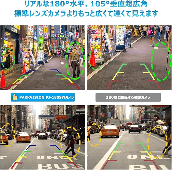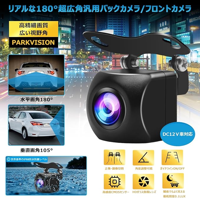PARKVISION 180 広角バックカメラ フロントカメラ リアルな水平180度垂直105度画角 魚眼広角レンズ IP68防水防塵レベル 長時間使用可能 正像鏡像切替 ガイドライン表示/非表示選択 4ピンRCA出力端子 トラック、SUV、ミニバンなどDC12V車に汎用
