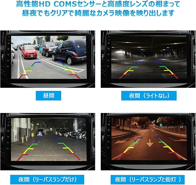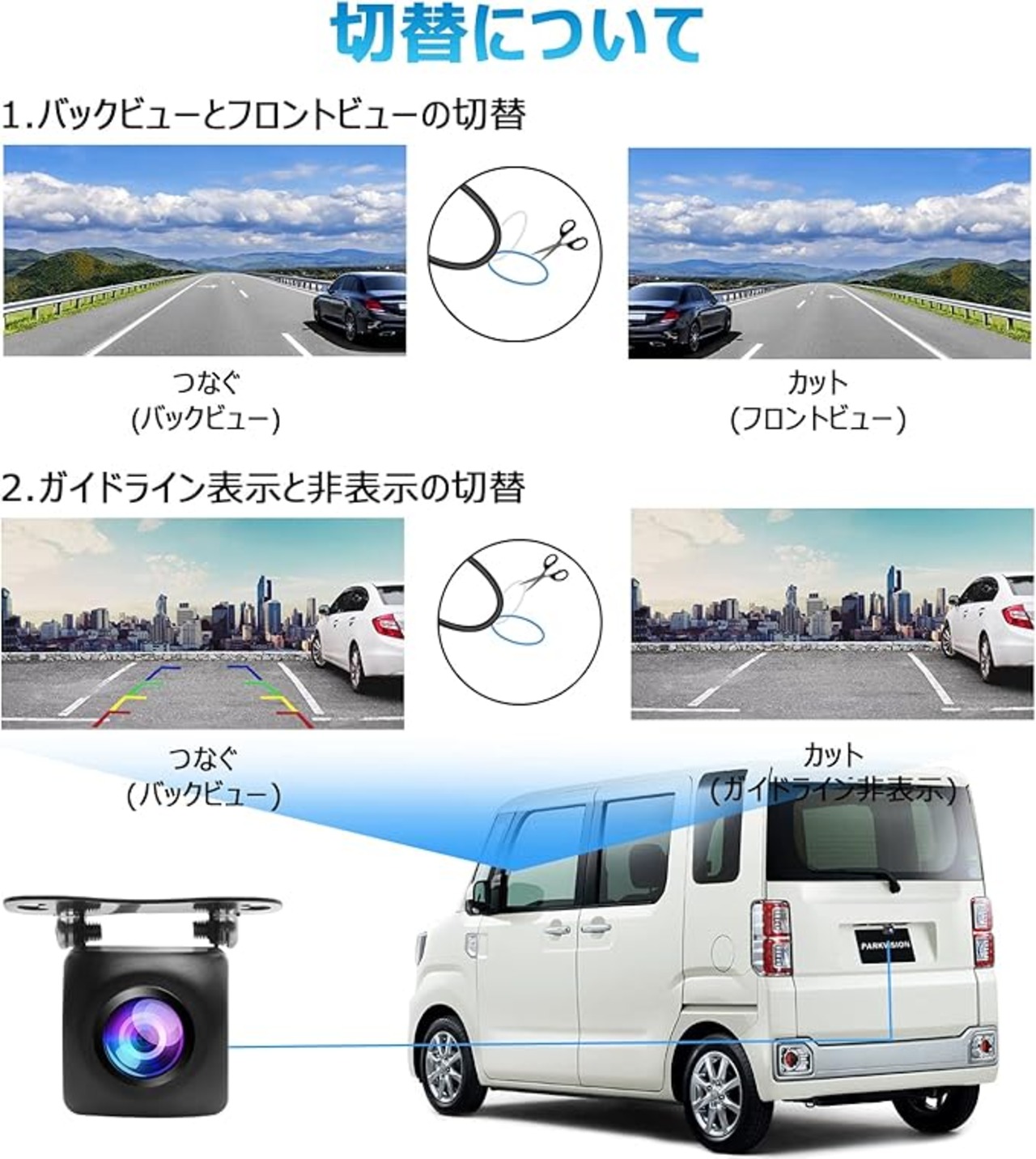 ガイドラインつきのリアビューカメラ:カメラの出力映像はガイドラインつきのバックビュー(鏡像)モードで、必要に応じて、ガイドラインの付かないフロントビュー(鏡像)に切り替えます。バックカメラだけでなく、フロントカメラ、サイドカメラとしてもご使用可能です。