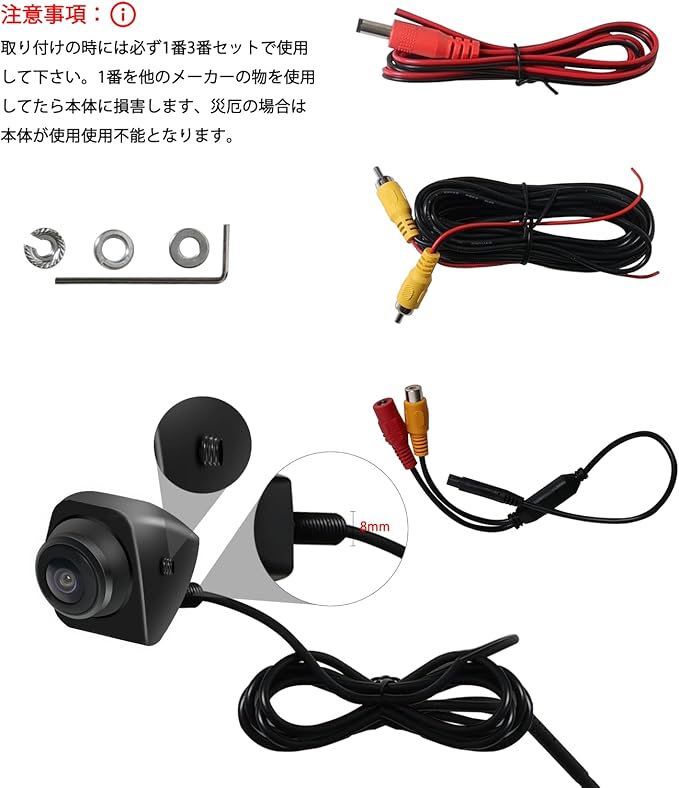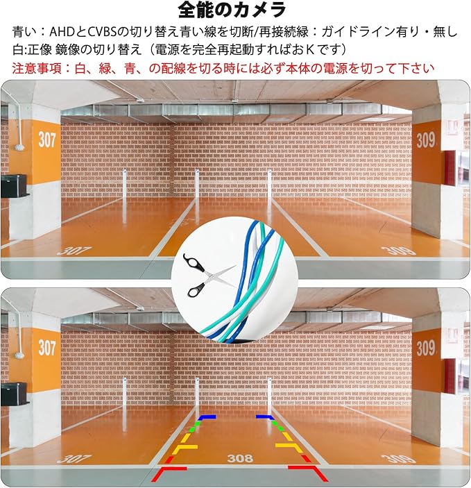 青い:AHDとCVBSの切り替え(何も映らない場合は青い線を切って 電源を完全再起動すればおkです)緑:ガイドライン有り・無し 白:正像 鏡像の切り替え ノイズ対策99%のノイズはバックランブの干渉の原因です。この場合は継電器を取り付けてACCで電気を取ってください。