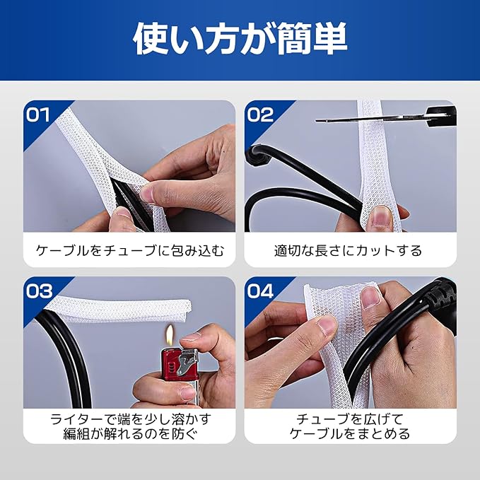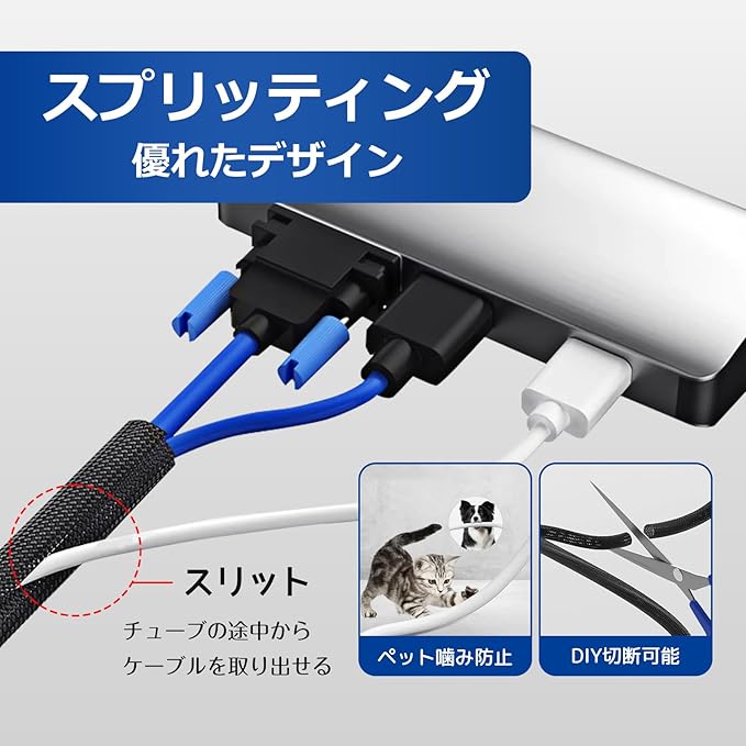 【スプリッティング・切断可能】スプリッティングのデザインでは、ケーブルスリーブが縦方向にスリットが入っているため、柔軟性や取り付けのしやすさが向上します。ケーブルをスリーブにスムーズの適切な位置に配置することができます。取り外すことも容易です。ケーブルスリーブを適切な長さにカットすることができます。切断した後、ケーブルスリーブが解れるのを防ぐために、ライターで端を少し溶かす方法は有効な手段です。
