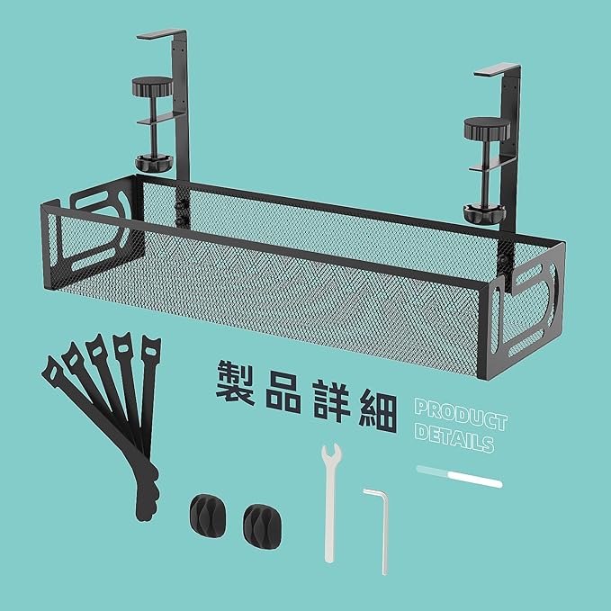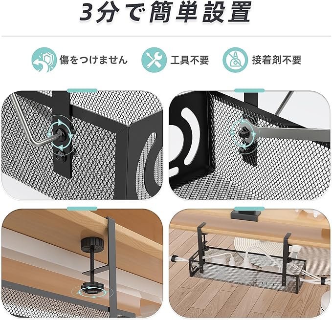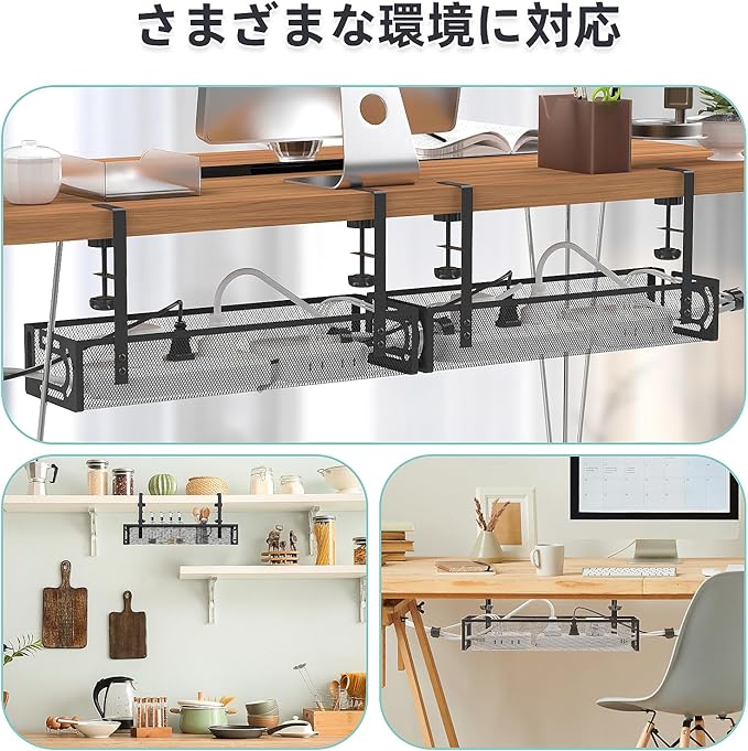 【ドリルレス取付】ネジや接着剤は必要ありません。私たちの卓下ケーブル管理設計は、テーブルフレーム(厚さ0.4~2.2インチ)に直接挟むために設計されています。黒いつまみを手動で回転させるだけで、ケーブルラックをテーブルにしっかり挟むことができ、テーブルを壊したり痕跡を残すことがなく、必要に応じて簡単に位置を変更することができます。