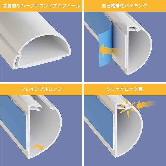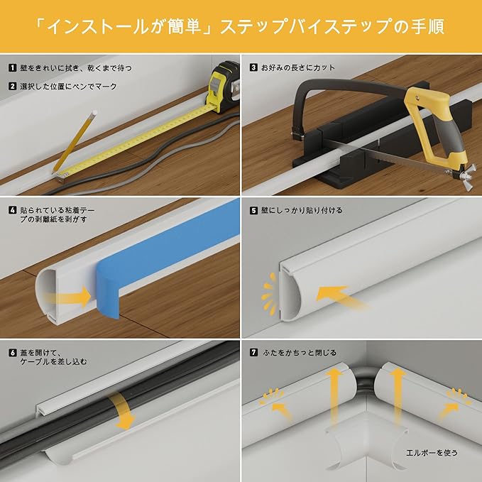 「インストールが簡単」全てのD-Line配線カバーは粘着式で、剥離紙をはがして壁に貼り付け、ヒンジ付き蓋によりケーブルの差し込みが簡単です。