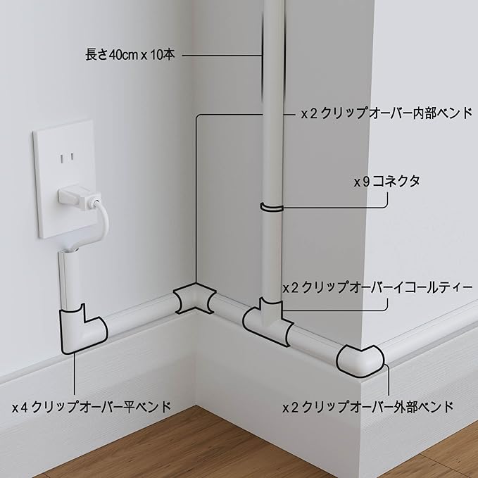 各パック内容物: 40cm長さ配線カバー 10本(トータル4m) (サイズ:幅3.0cm 高さ1.5cm 長さ40cm) ジョイントパーツ19個(フラットエルボー4個、インナーエルボー2個、アウターエルボー2個、3 WAYジョイント2個、コネクタ9個)